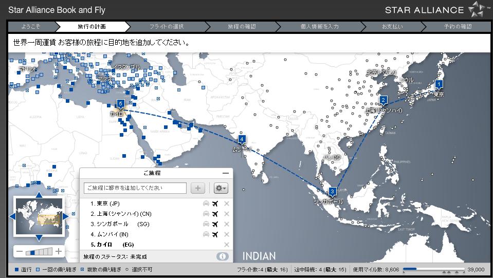 最終的に、東京→上海→シンガポール→ムンバイ→カイロ→イスタンブール→チュニジア→フランクフルト→リスボン→ボストン→サンフランシスコ→東京というルートを妄想。