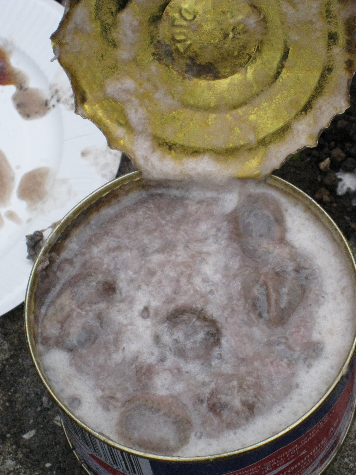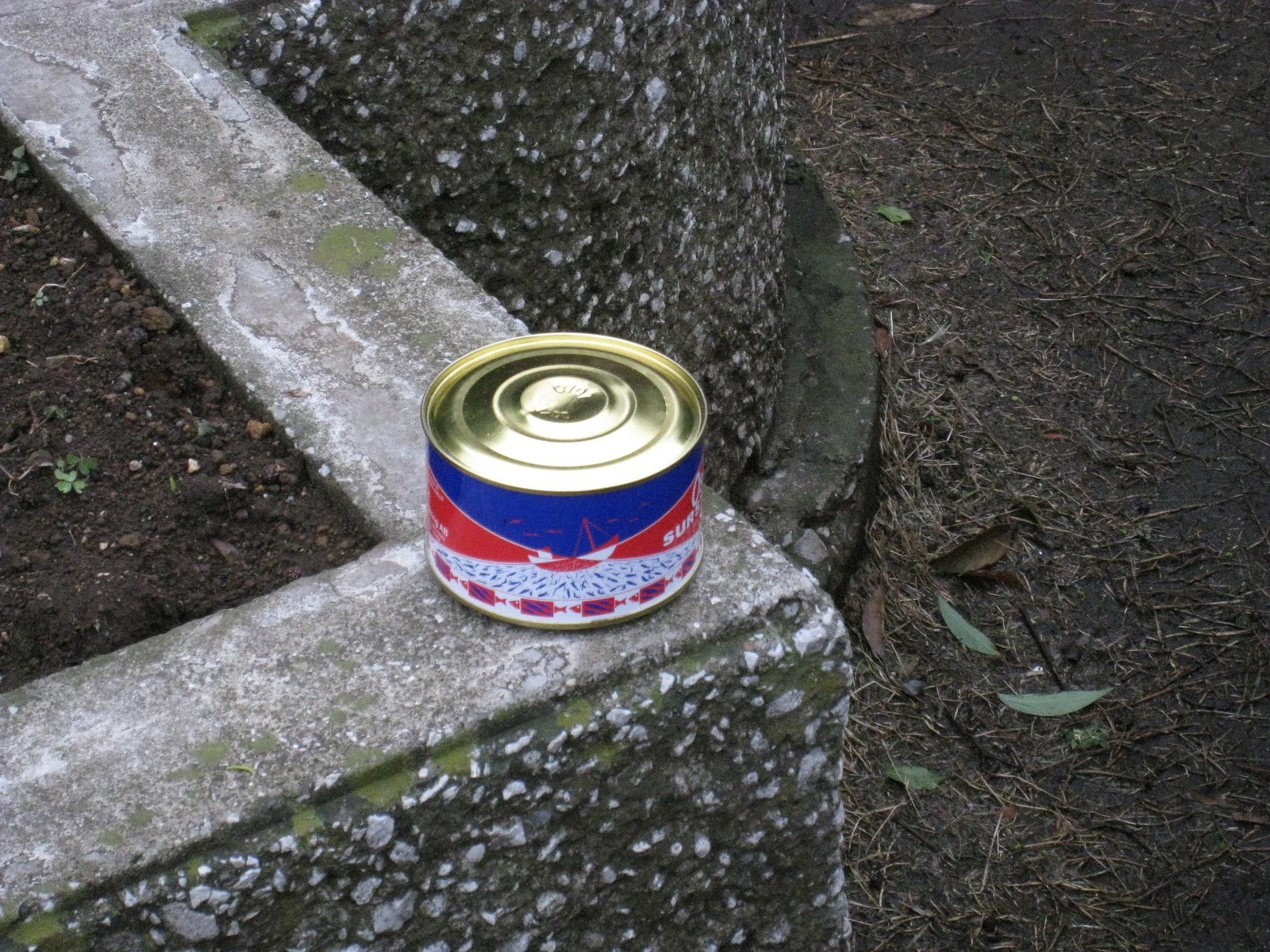 人気の少ない公園を選んで、いよいよ開けることになりました。屋外での開封は必須らしく、現地でも外で食べているそうです。写真の通り、缶は膨らんでいます。