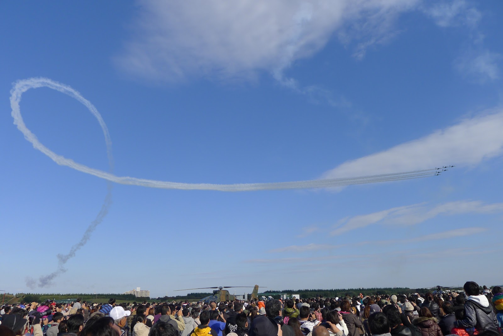 航空ショーは思った以上に迫力がありました。最新鋭のF2、前線で活躍するF15、それにアクロバット飛行専門のブルーインパルスと1時間ちょっとのショーでしたが、時を経つのを忘れるくらいに堪能できました。